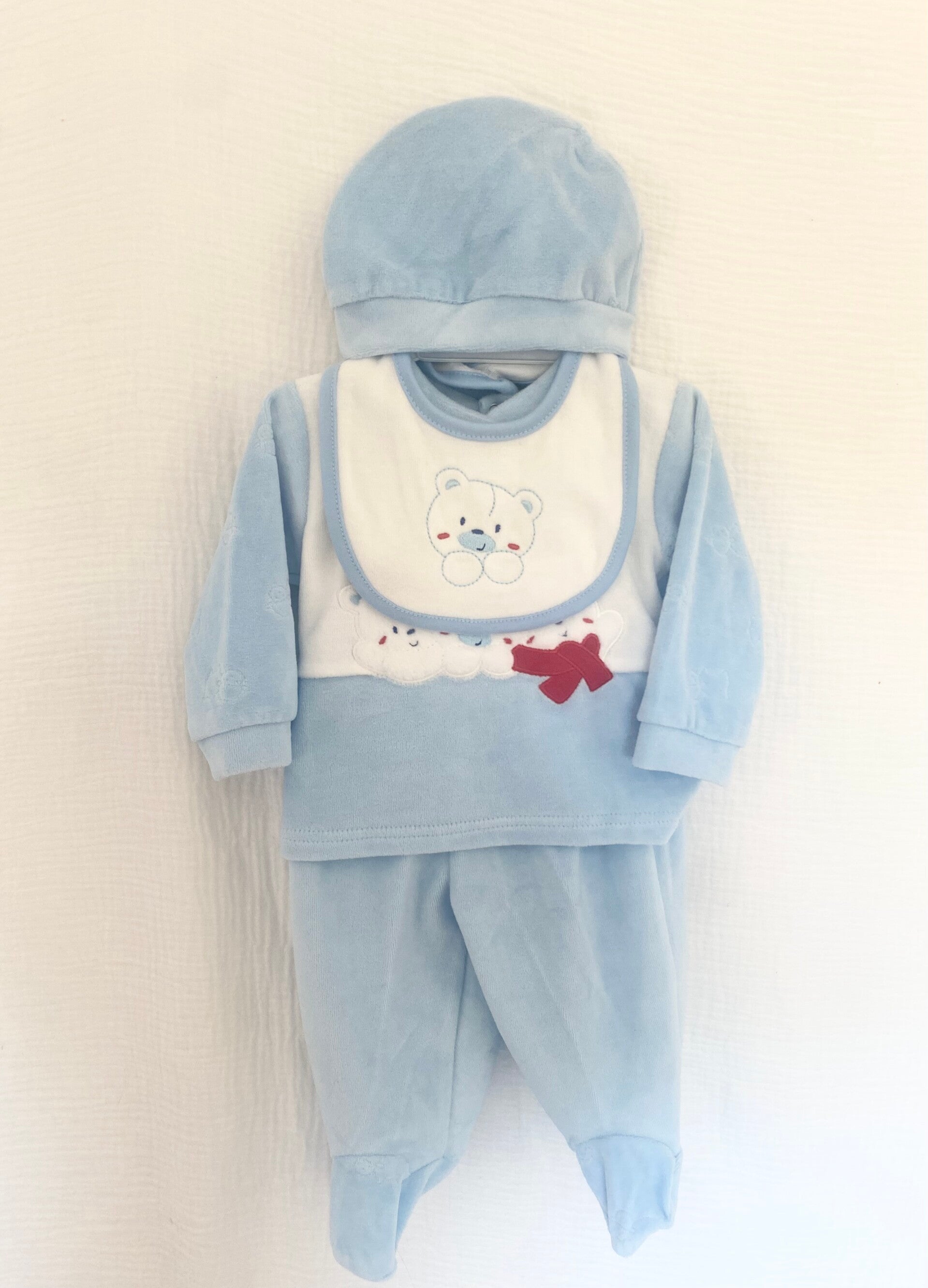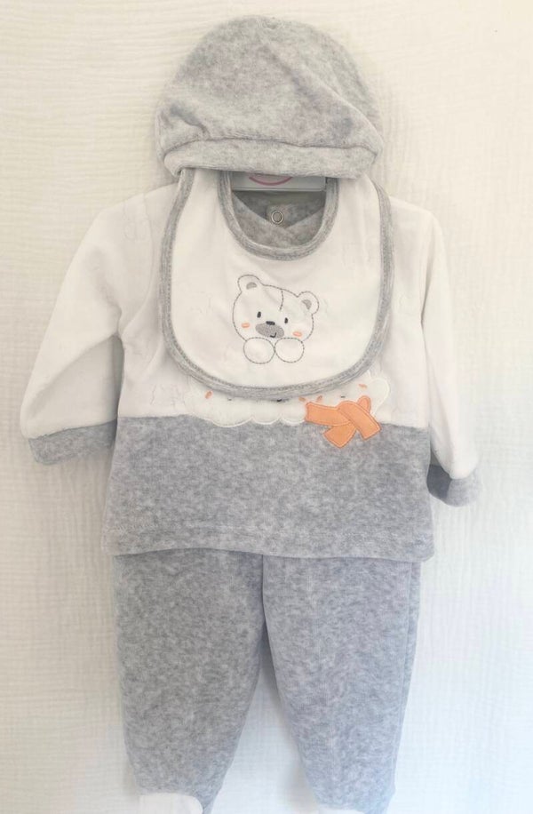 Offrez à votre bébé un ensemble complet, confortable.Cet ensemble bébé 3 pièces comprend un haut à manches longues, un pantalon avec pied, un bavoir assorti et un bonnet, parfait pour garder bébé bien chaud.