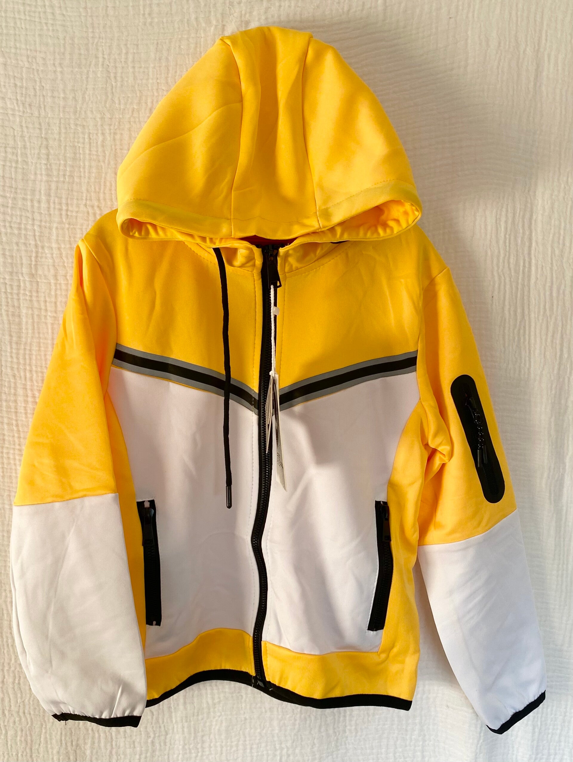 Apportez du style et de l’énergie à la tenue de votre enfant avec cet ensemble survêtement enfant jaune 2 pièces. Moderne et tendance, il se compose d’une veste à capuche zippée et d’un pantalon assorti, parfait pour un look sportwear dynamique.